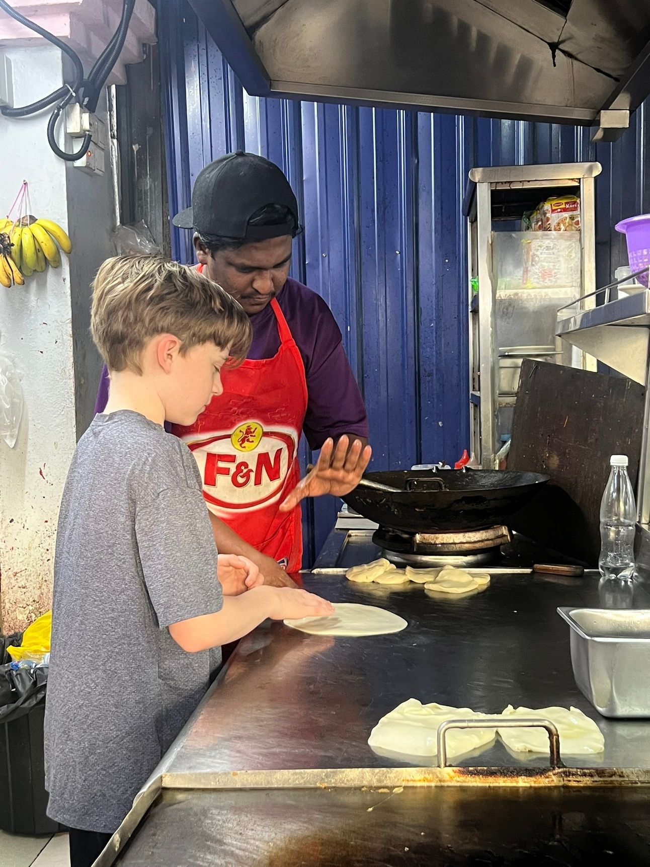 Street Food: I signed us up for a KL Street Food tour called “Sambal Streets,” which promised to take us to off the beaten path locations, sampling upwards of 15 different foods and beverages. In general, I love doing food tours in cities, particularly early on in our stay to get a feel for the local culinary scene. This tour did not disappoint. We began with a quick visit to a local market to familiarize ourselves with Malaysian spices, fruits, and vegetables. The best way I can describe Malaysian cuisine is that it’s a hybrid of Chinese, Indian, and Indonesian food traditions, with elements that make it uniquely Malaysian. Across visits to several stalls and restaurants, we tried various fruits (longan, mangosteen, longan, durian), as well as drinks (calamansi sugar juice, mango smoothie), and savory dishes (curry, satay, mee goreng). We all tried our hand at making roti, which tasted better than it looked while we were stumbling our way through the process. I also appreciated the tour guide’s emphasis on reducing food waste, as apparently Malaysia’s food waste is extremely high (Google says 8.3 million metric tons annually). Before bringing us any food, she asked us how many portions we would want between the five of us. Given the volume of food, rarely was the answer five, and I’m glad she was conscientious about not over-ordering.