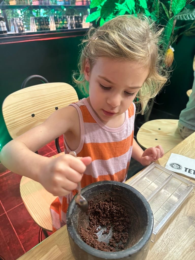 As promised, we took Calla on many fun off-site adventures while her brother was gone. We surprised her with a chocolate making workshop at Teta Freda. There, we ground cacao beans with a mortar and pestle, mixed them with coconut oil, brown sugar, and melted chocolate, and poured them into molds. Each of us decorated two bars which we then brought back to the farm to eat later. Calla was delighted.