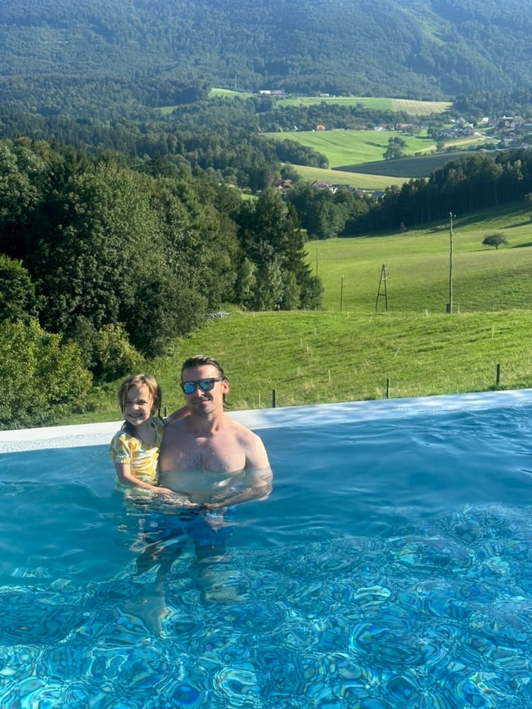 On our final day as a threesome, we ventured to a town called Rogla where we completed a 6-mile hike to Lake Lovrenska. Calla was insistent that she needed to go in her carrier, and we kept encouraging her to walk, telling her that we could reassess once we were at the top of the trail. Once there, she asked about the carrier again, and we communicated belief in her capability and reminded her that downhill is much easier than uphill. She committed to trying, and as we were walking back down, we marveled at her burst of self-confidence. She was engaging in so much positive self-talk (e.g., “it’s much more funner going down;” “I can do it!”) I tried to explain the concept of a self-fulfilling prophecy, and when we finished the hike, Calla was SO proud of herself for completing it without assistance. We took a quick ride on another summer toboggan, though it wasn’t nearly as fun as the one in Bled, and headed back to the farm for ice cream and pool time.