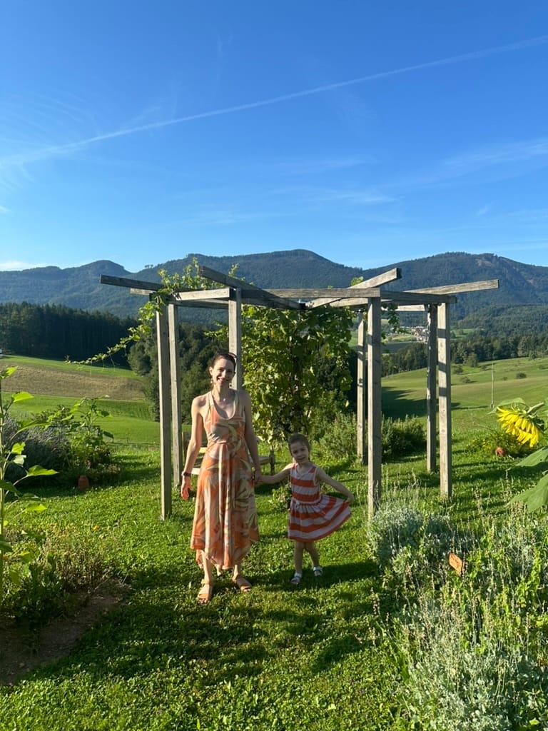 And… we did! We stayed at Kmetija Urska (Tourist Farm Urska). Months ago, I’d stumbled upon the farm’s website, but I didn’t think I could make the logistics work given the farm’s off the beaten path locale. However, when the summer camp I was also eyeing for the boys announced a location change, I was delighted to learn that the Kmetija Urska was only 40 minutes away from Lake Velenje. It seemed like kismet, so I booked both the camp for the boys as well as the farm for a week-long stay. I cannot emphasize enough how special this farm stay was. The owner, Urska, provided three meals a day, made primarily with local ingredients, many of which are grown on site. Our first morning, Calla was handed a basket and sent to the hen house to collect eggs. I thought she would find just one or two, but she returned to the kitchen with 14 eggs! (There were far more, but we wanted to leave some for the other children to collect.) The property was surrounded by apple trees, as well as raspberry and blackberry bushes, and all the food was both traditional and spectacular – breakfast was homemade sourdough bread, spreads, pates, meats, yogurt, granola, juice (lavender, elderflower), and cottage cheese. For lunch, there was a choice of soup (if you were staying on property) or sandwiches (if you were heading out for the day), and then for dinner, there was more soup, a salad, a main course, and dessert. Urska and her family also make their own organic wines, one red and one white, both of which were delicious, though we were partial to the white. The property has sweeping views of the meadows, which were best viewed from the small swimming pool. We went swimming every day, and Calla is rapidly improving her skills. Hens, pigs, sheep, rabbits roam the property, as well as one dog and some number of cats. During our stay, two baby lambs were born, and we enjoyed visiting them in the barn.